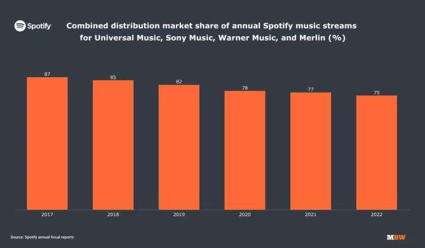 ·2月7日,四大主流唱片公司(這裏指的是環球音樂、索尼音樂、華納音樂以及獨立音樂廠牌Merlin)在過去五年中累計失去了Spotify 12%的市場份額。