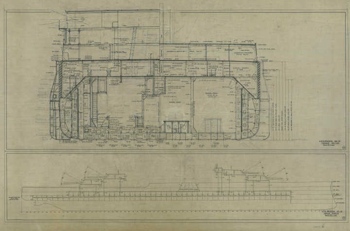 (1) One 500 lb bomb hit the face plate of #4 turret on the stbd side, glanced off and passed through the deck at Fr. 123, stbd side of the quarterdeck, betwthe Captain’s hatch and #4 turret and exploded in the Captain’s Pantry, destroying the Captain’s Pantry and Admiral’s Pantry. A small fire started which apparently burned itself out in a short time.(2) One. 500 lb bomb hit the ship at Fr. 85, port galley deck. Width of hole in deck is about 24 inches in diameter, depth of penetration is not known.(3) One 500 lb or 1000 lb bomb hit at Fr. 96, port side of quarterdeck in M.B. Stowage, depth of penetration is not known, width of hole in deck is approx, 24 inches.(4) One bomb, approx. 1000 lb, hit on the boat deck just fwd of stack, at Fr. 67. Width of hole on boat deck is approx, four feet, depth of penetration is not known.(5) One heavy bomb apparently 1000 or 2000 lb, went down the stack. Extent of damage is not known.(6) One bomb hit, size of bomb not known, on boat deck at Fr. 66, portside, by #4 Antiaircraft gun ammunition hoist, extent of damage done by this bomb is not known.(7) One heavy bomb hit, estimated over 1000 lb, at Fr. 73, portside of boat deck just fwd of the incinerator, by #6 Antiaircraft gun. The extent of damage done by this bomb is not known.(8) Apparently one large, possibly 2000 lb, armor piercing bomb hit forecastle by #2 turret, which it is believed penetrated to the black powder magazines, setting off the smokeless powder magazines adjacent and causing the explosion which destroyed the ship fwd.