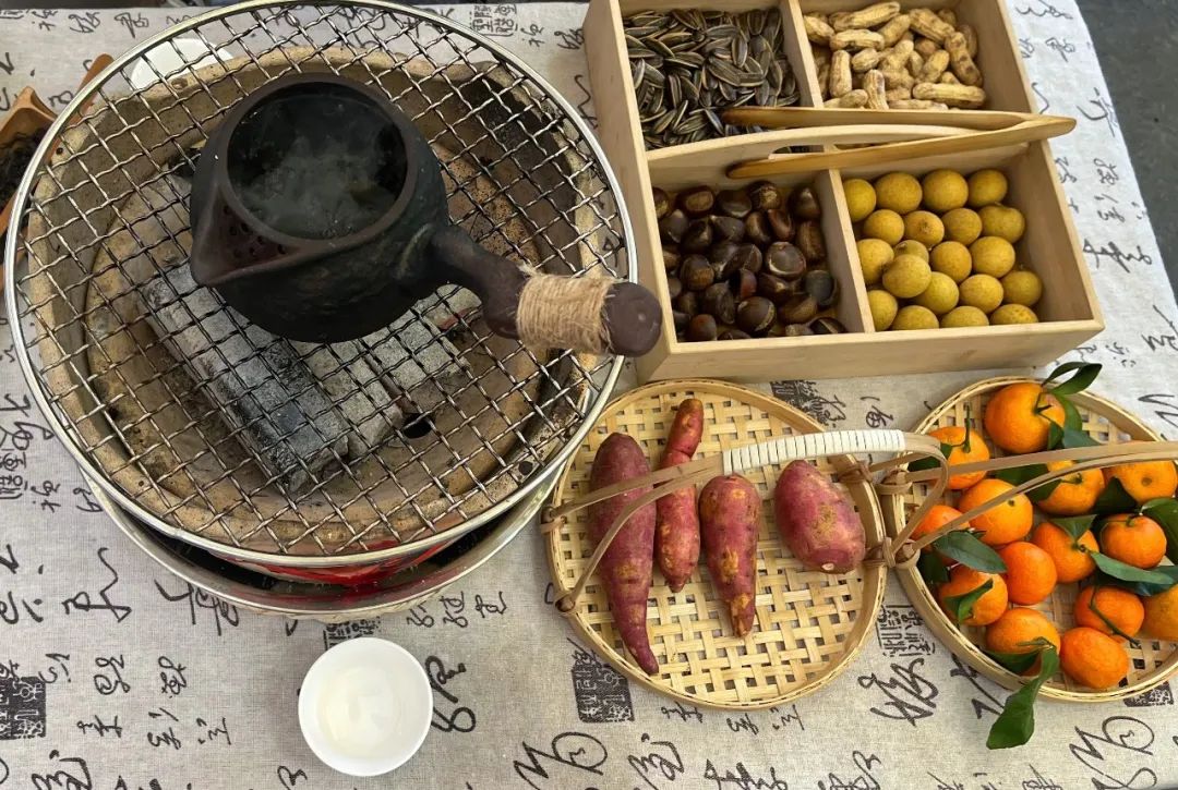 冬日午後,生一爐炭火、燒一壺熱茶,桌上碼放着花生、桂圓、栗子之類的乾果,烤上幾顆橘子或柿子,茶香嫋嫋,爐火氤氲,與三五好友圍坐,邊喝茶邊説笑,偷得浮生半日的清閒。