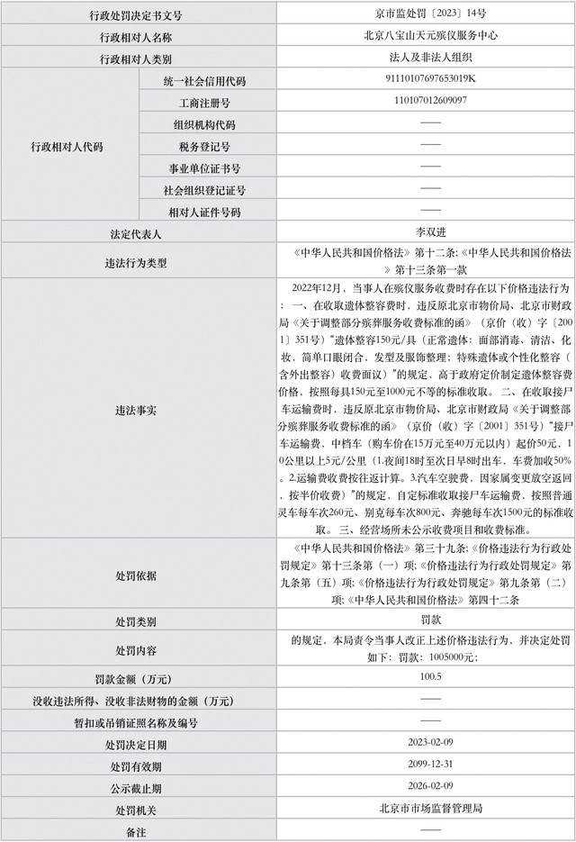 此前,2022年8月,北京八寶山天元殯儀服務中心因“嚴重”價格違法,被朝陽區市場監管局從重處罰,總計罰款50.53125萬元,沒收違法所得262.5元。