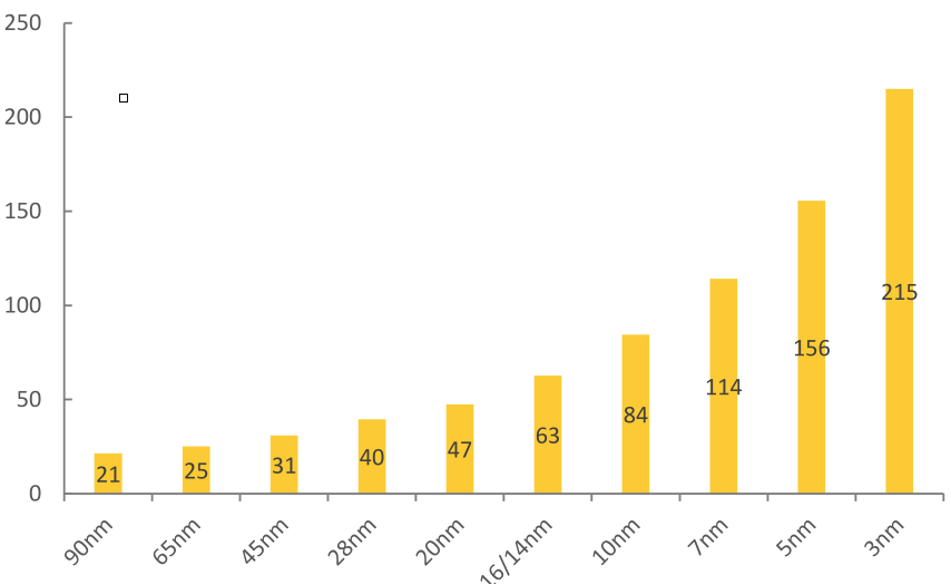 再看資金壁壘,隨着工藝節點提高,新一代生產線所需的投資額成倍甚至數十倍地增加。舉例來説,2020年台積電宣佈在美國投建的5nm工廠投資額約合120億美元,未來3nm產線的投資額預計將達到驚人的200億美元。