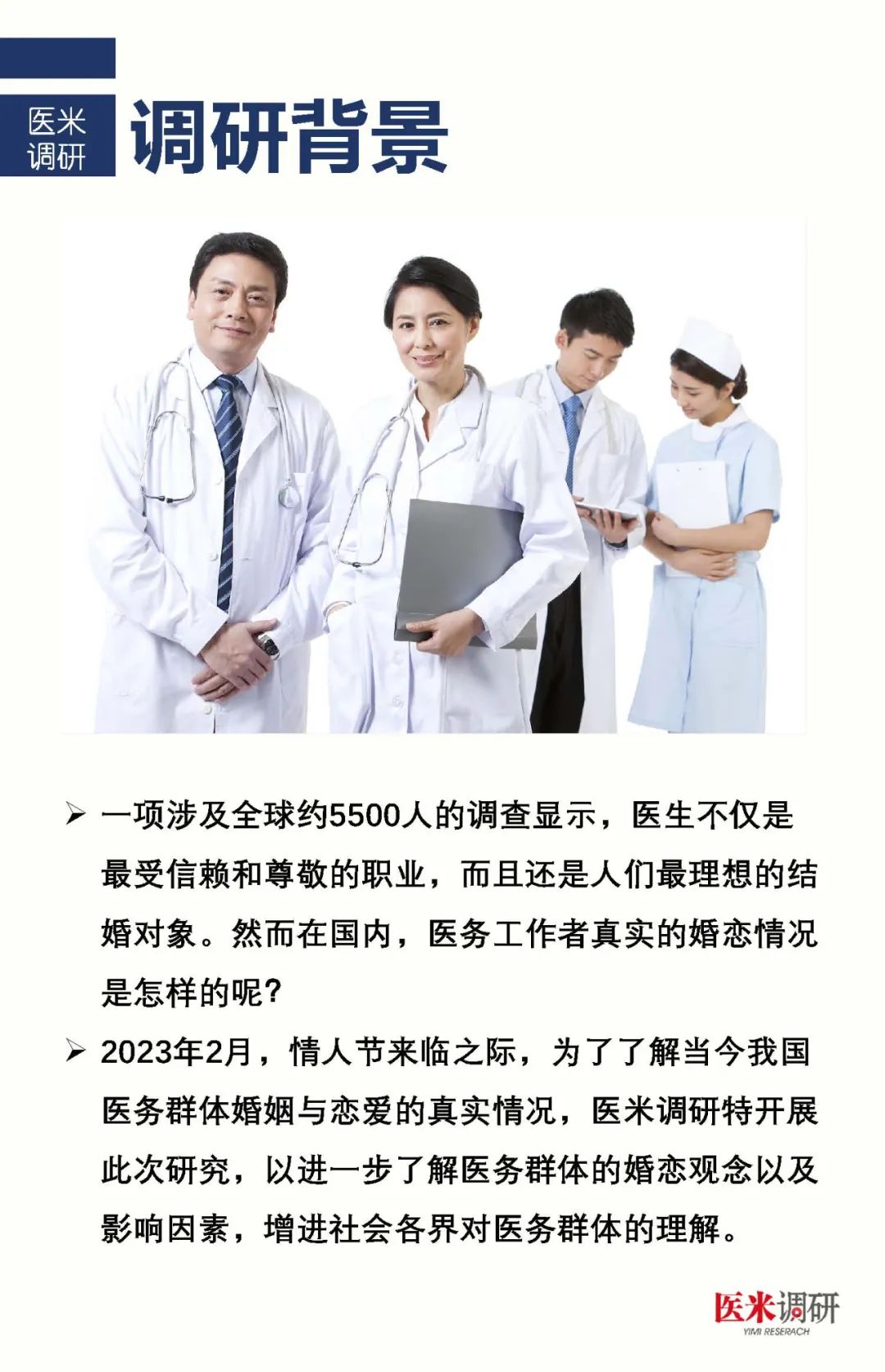 而作為備受婚戀市場歡迎的醫生,他們的真實情況又是怎樣的?近日,“醫學界·醫米調研”向2289名醫生髮起了在線問卷調查,以進一步瞭解醫護羣體的婚戀觀念及其影響因素,希望增進社會各界對醫護羣體的理解。