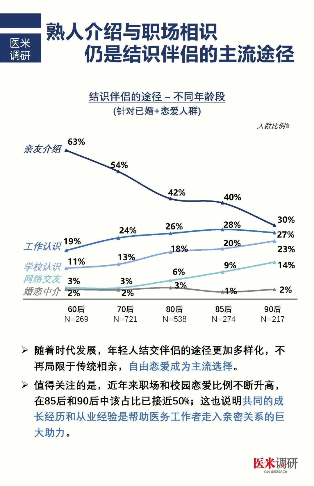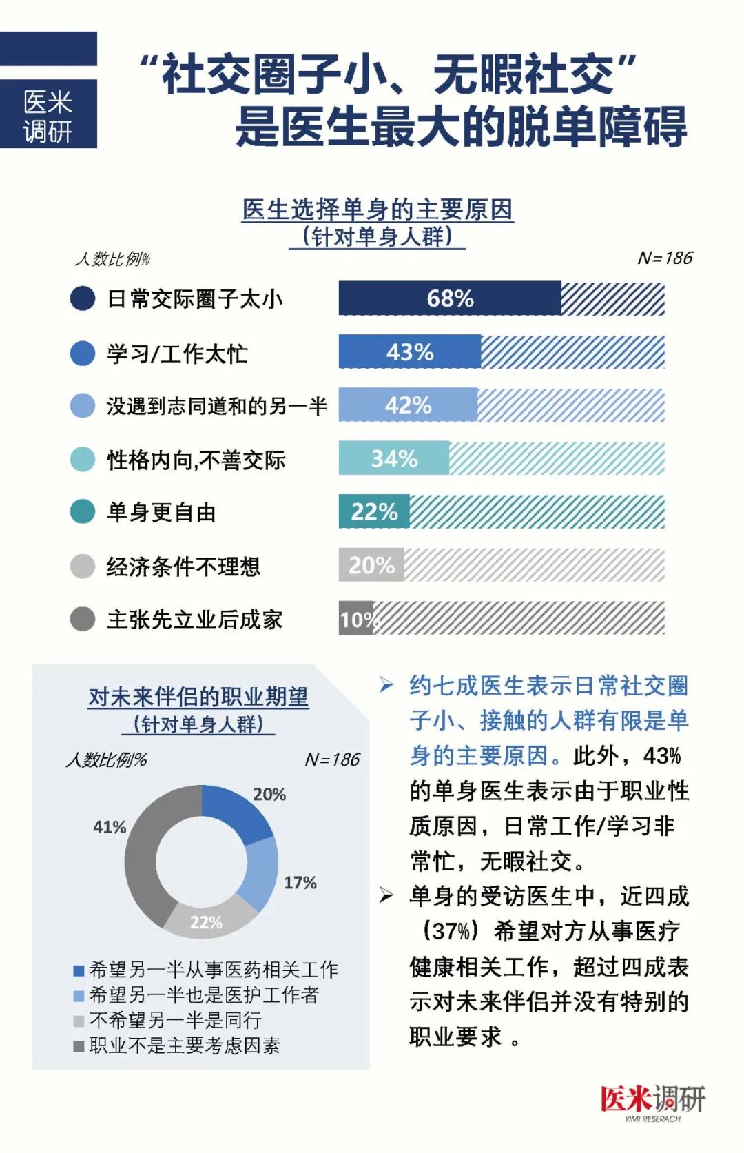 調研結果顯示,在所有受訪醫護工作者中,近九成處於婚姻或戀愛狀態,平均結婚年齡為30.7歲。其中,“男醫生+女醫護”的組合較為普遍,而女醫生則更傾向於工作穩定且有體制保障的伴侶。還有近七成的單身醫生告訴“醫學界”,自己脱單的最大障礙是社交圈子太小。