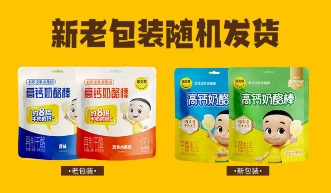 以妙可藍多為例,在2020年妙可藍多發佈了40%乾酪含量的金裝奶酪棒,在包裝配色風格、產品名上與此前的藍袋零食奶酪棒形成差異。