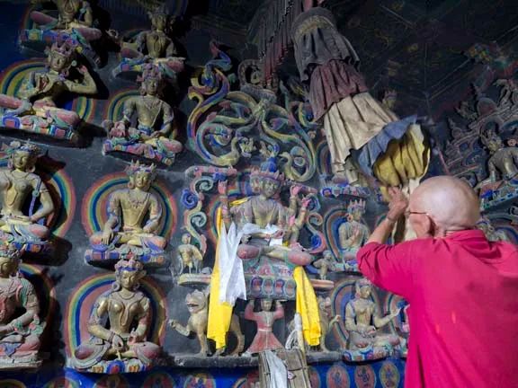 拉隆寺與塔波寺屬於同一時代,相傳都是仁欽桑布所建,可算是個“低配版”的塔波寺。這種半懸在牆上的立體泥塑是早期“阿里三圍”所特有的——確切地説目前除了司丕提地區的拉隆寺和塔波寺、拉達克地區的阿奇寺和芒玉寺(Mangyu,這個地方會在後面章節提到)這四座寺廟之外,你在世界上任何其他地方都見不到。