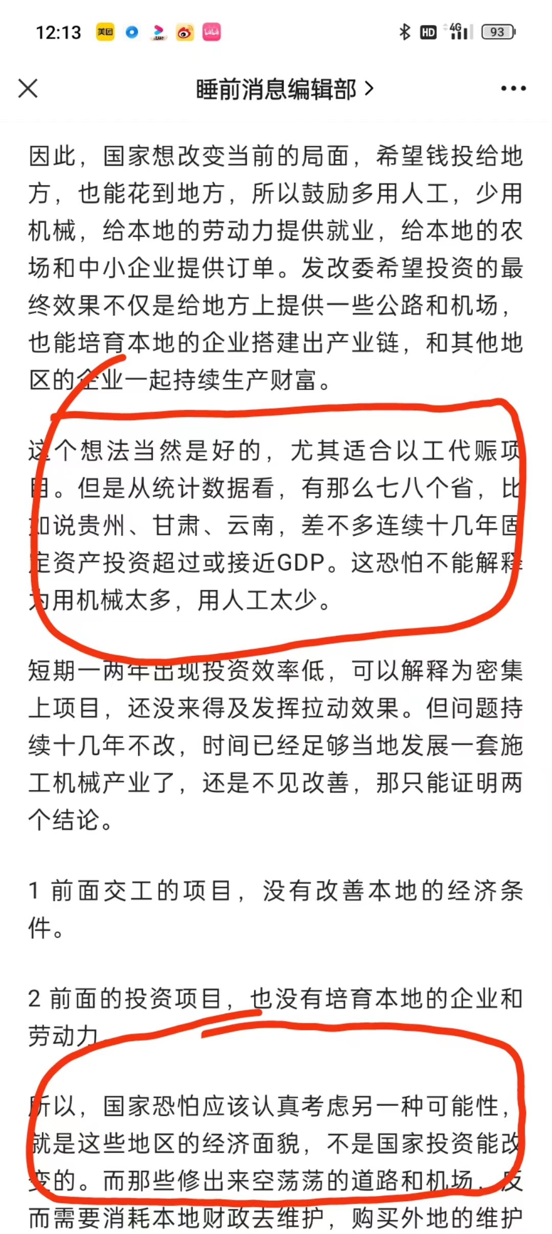 在這裏,圍繞國家對中西部進行大量新基建投入和產業引入這件事情,馬督工認為它缺乏經濟效率(也是沒有對應的GDP產出),所以對它的整體評價是負面的。