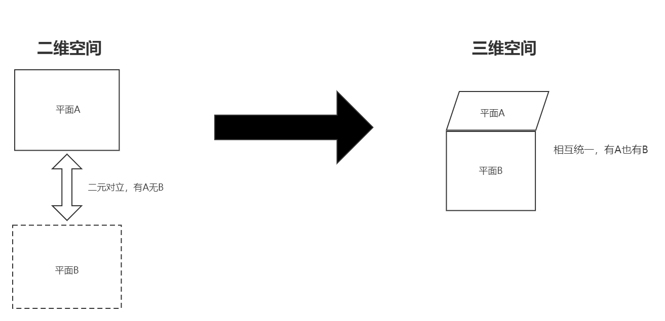 以此類推,二維尺度下兩個互相排斥的面,那一定也是在三維這個空間尺度,也即是面的集合下,得到對立統一。