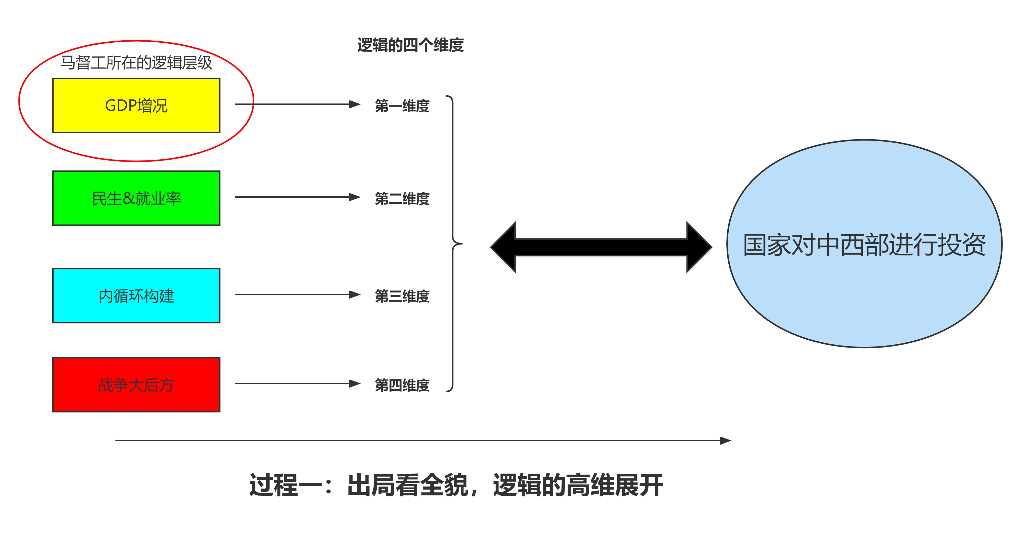 把國家投資中西部作為議題,把GDP增況/投入產出比作為一個評價標準。那麼在馬督工所理出的這條邏輯線就是:GDP增況的結果--->國家投資中西部的價值判斷。