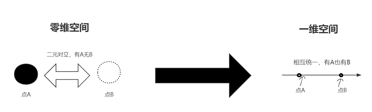 一維是線,是無數點的集合。在一維的觀測尺度下,A和B就成為存在於這條無限延伸的直線上的兩個點。本來在零維互斥的A點與B點,此時在一維尺度得到了共存,那麼就可以説,A點與B點在零維上不可調和的二元對立的矛盾,在一維尺度下得到了對立統一。