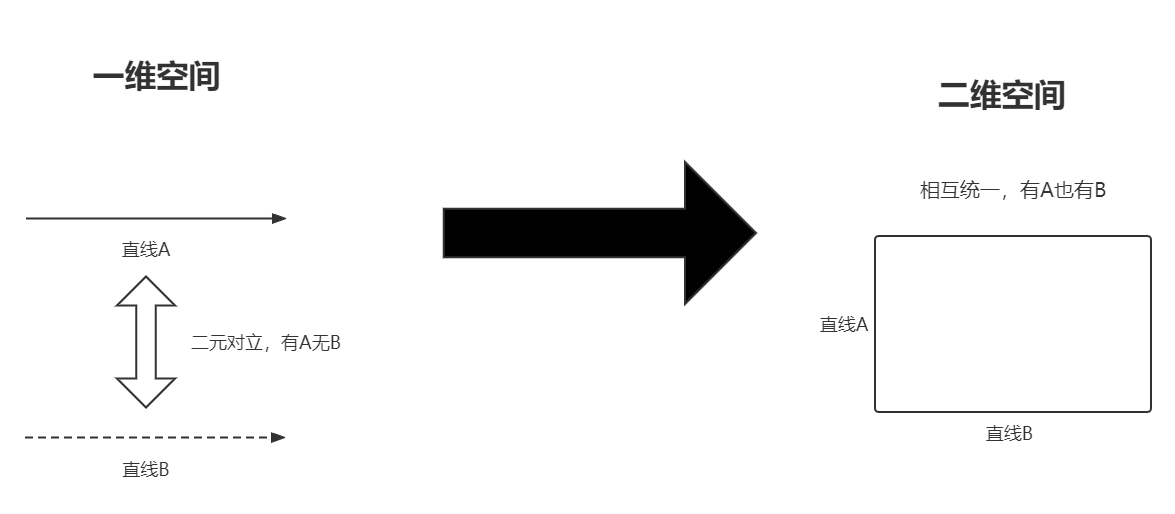 沒錯,二維是面,而面是線段的集合。在二維尺度下,A線段和B線段共存於同一個平面上,因此他們在一維尺度上不可調和的二元對立的矛盾關係,在二維尺度下得到了對立統一。