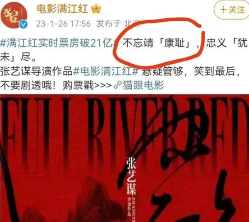 但是這不奇怪,因為[滿江]紅的宣發營銷團隊一貫如此,他們能夠在海報上寫出“靖[康恥]”,寫出“踏破山河”,一個悲憤的歷史故事,被他們包裝成所謂的“閤家歡”,“喜劇”,鼓吹什麼“紅運當頭,笑到最後”…….面對觀眾的質疑,他們直接在海報上寫出“跟我鬥,你們還差得遠”。