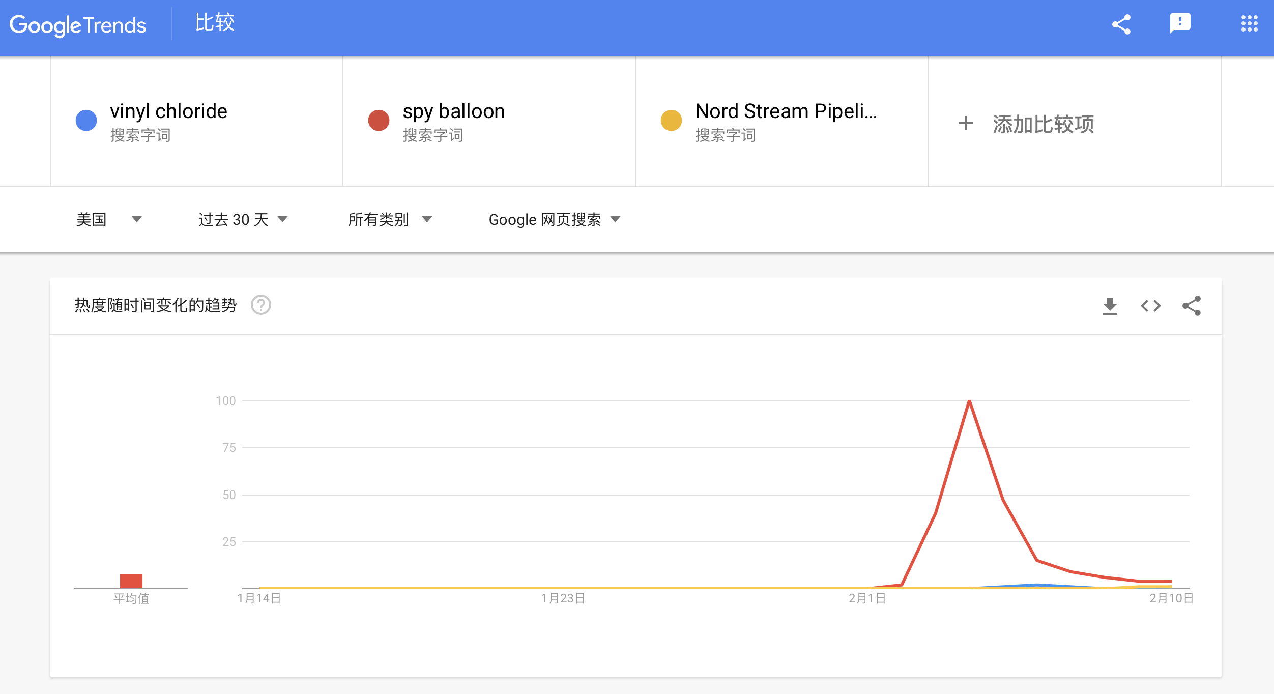 火車脱軌、氣球事件和北溪事件熱度對比趨勢