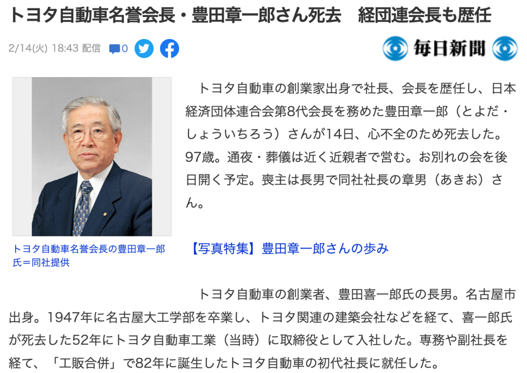 豐田第三代掌門人豐田章一郎逝世,他是雷克薩斯品牌主導者,也是豐田汽車全球化推動者。2009年他將豐田汽車公司交給其長子豐田章男。