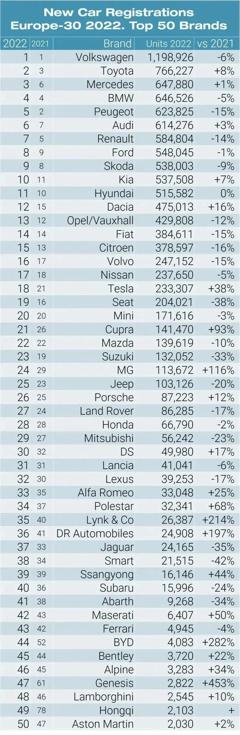 大眾依然no.1,特斯拉排18名。特斯拉也是目前歐洲排名,最靠前的電動車企。