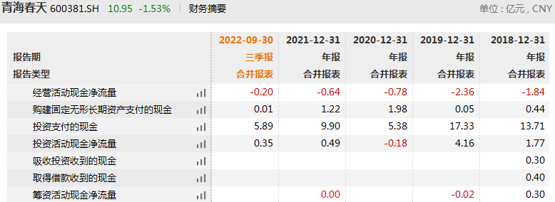 此外,時代數據還發現,青海春天2018年至2021年度經營活動現金流持續為負值,且在2022年前三季度仍為負值。