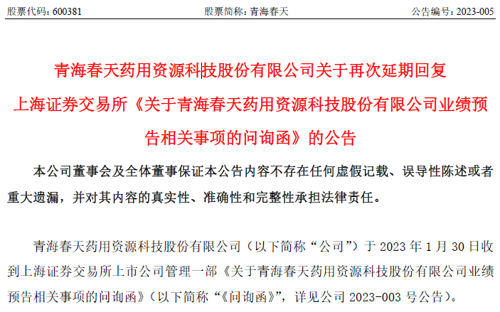 2023年2月7日,青海春天藥用資源科技股份有限公司(以下簡稱“青海春天”)披露了關於延期回覆上海證券交易所《關於青海春天業績預告相關事項的問詢函》的公告,稱由於《問詢函》涉及的內容較多,為確保回覆內容的準確和完整,經向上海證券交易所申請延期5個交易日內回覆《問詢函》,並履行信息披露義務。