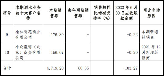 此外,時代數據還發現,在前十大客户中,報告期內新增經銷商金華市讀花酒業有限公司、杭州讀花酒業有限公司、榆林聽花酒業有限公司分別成立於2022年3月21日、2022年4月8日和2022年4月26日,均為報告期內成立便迅速成為公司經銷商。