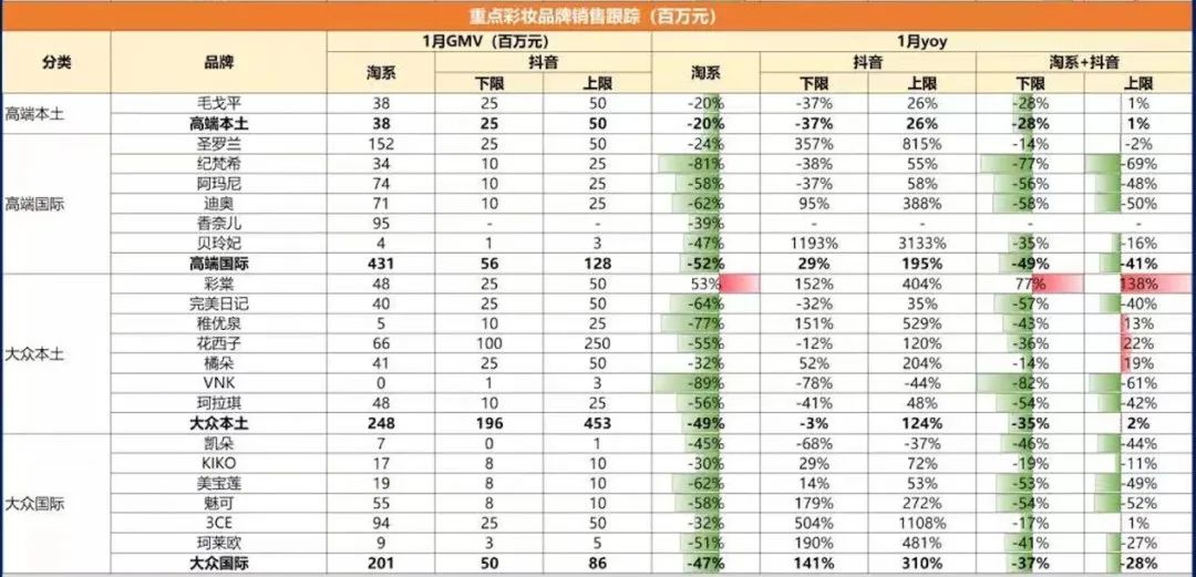 美妝市場其實沒有線下商場、專櫃、美妝集合店流量暴增所呈現出來的那種熱鬧,也談不上所謂的報復性消費。從上個月來看,據魔鏡及飛瓜數據統計,1月彩妝品類銷量數據普遍下滑明顯,尤其是淘系平台被抖音分流,護膚及彩妝品類的銷售數據同比降幅均達到40%左右。