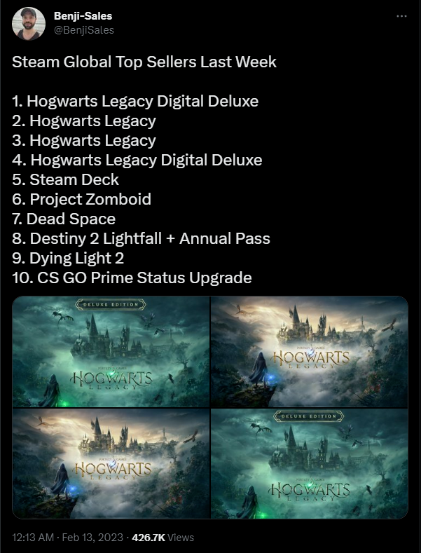 然而即便如此,《霍格沃茨之遺》的銷量和熱度依舊勢不可擋。除了發售首週末在線玩家高達80萬外,本週Steam遊戲的暢銷排名上,《霍格沃茨之遺》直接以四個版本佔據了銷量榜前四,將Steam Deck擠到了第五。