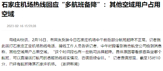 石家莊機場倒是非常坦率:其他空域用户佔用空域。