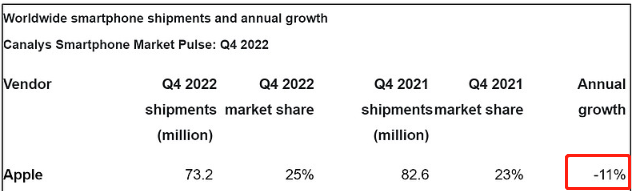 市場研究機構Canalys發佈數據顯示,2022年第四季度,iPhone全球市場出貨量為7320萬台,同比下降11%;在中國市場,iPhone出貨量為1640萬台,同比下降24%。傑富瑞分析師Edison Lee表示:“折扣似乎比我們在1月份發現的3%~4%要大,體現出需求疲軟的跡象。”