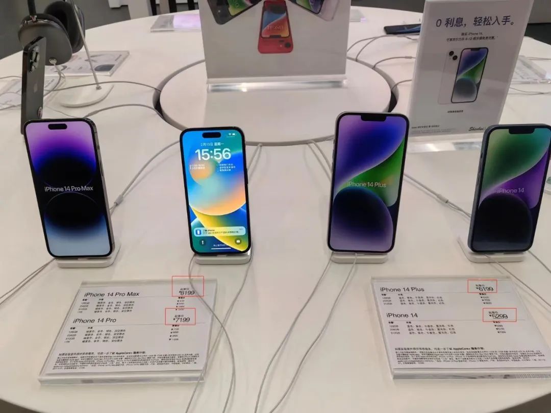 《IT時報》記者走訪上海多家蘋果直營店與授權店後發現,直營店依舊維持官網價格,並未降價;授權店內的iPhone14全系均有600~800元的降幅。此前流傳的蘋果授權經銷商SUNPIE內部文件,iPhone 14 Pro和iPhone 14 Pro Max所有版本均下調700元,時間從2月5日持續到4月1日,覆蓋所有門店的消息,也在走訪中得到證實。