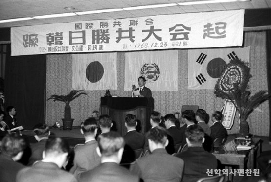 1970年9月,“國際勝共聯合”在東京武道館召開了由神社本廳等23個推進團體、自衞隊之友會等為贊助團體的“世界大會”,前首相岸信介出任大會推進委員長。1974年,日本“統一教”主辦“希望之日晚餐會”,有40多名日本內閣大臣和國會議員參加。
