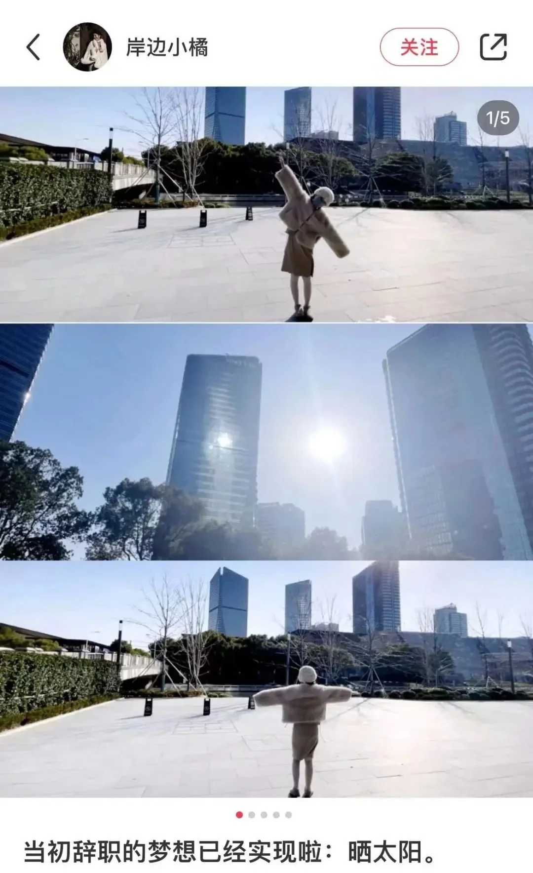 在重慶一家房地產公司做策劃的康妮也對“曬太陽”這件事感受強烈。在冬天不常見到陽光的霧都,晴朗的天氣是珍貴的。一天吃過午飯後,她走在街上,感受到了很久沒見過的太陽。原本計劃在日光下逗留十分鐘的她,卻被手機裏工作羣裏的消息一再催促,只能快步回到了寫字樓。