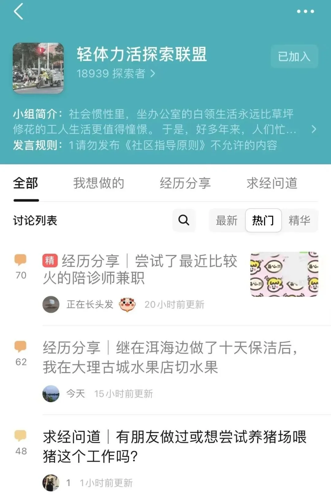 久期本來以為只有少部分人會這樣想,但隨着組員人數增加,她發現“辭職嘗試輕體力勞動”可能會成為年輕人的生活新趨勢。