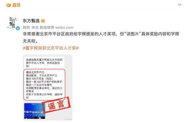 董宇輝闢謠:獲得百萬房產和現金獎勵不實_風聞
