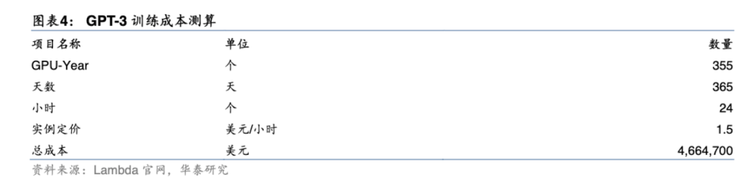 根據Lambda官網數據,微軟為OpenAI設計了一個包含10000塊Nvidia V100 GPU的分佈式集羣進行GPT-3的模型訓練,由於模型參數量較大(共1750億參數),訓練完成共耗費30天,消耗總算力為 3640PF-days。以Nvidia Tesla V100的 Lambda GPU實例定價為1.50 美元/小時測算,GPT-3的完整訓練成本將達到466萬美元/次。