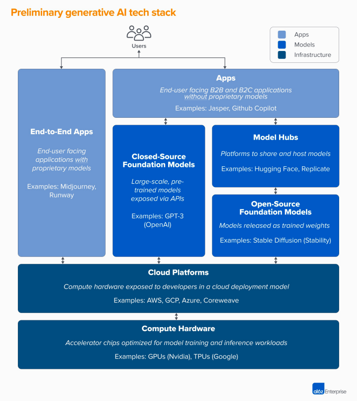 **而這也是雲廠商的“支柱貢獻”所在。**近期,投資機構A16Z發表了文章《Who Owns the Generative AI Platform?》認為,生成式AI中的近乎一切,都會在某個時刻通過雲託管的GPU(或TPU)。