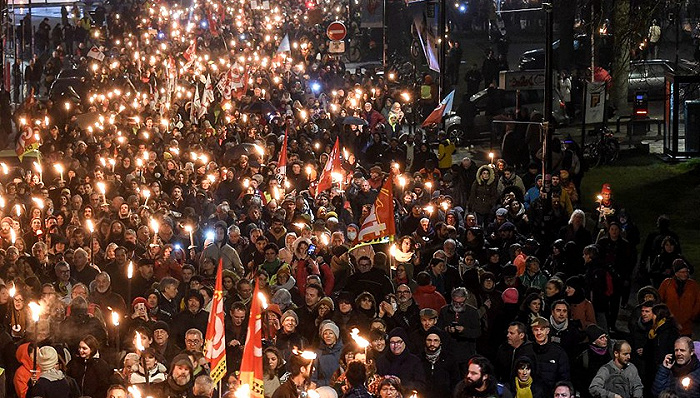 2023年2月16日,法國南特,罷工者舉行火把遊行。圖片來源:視覺中國