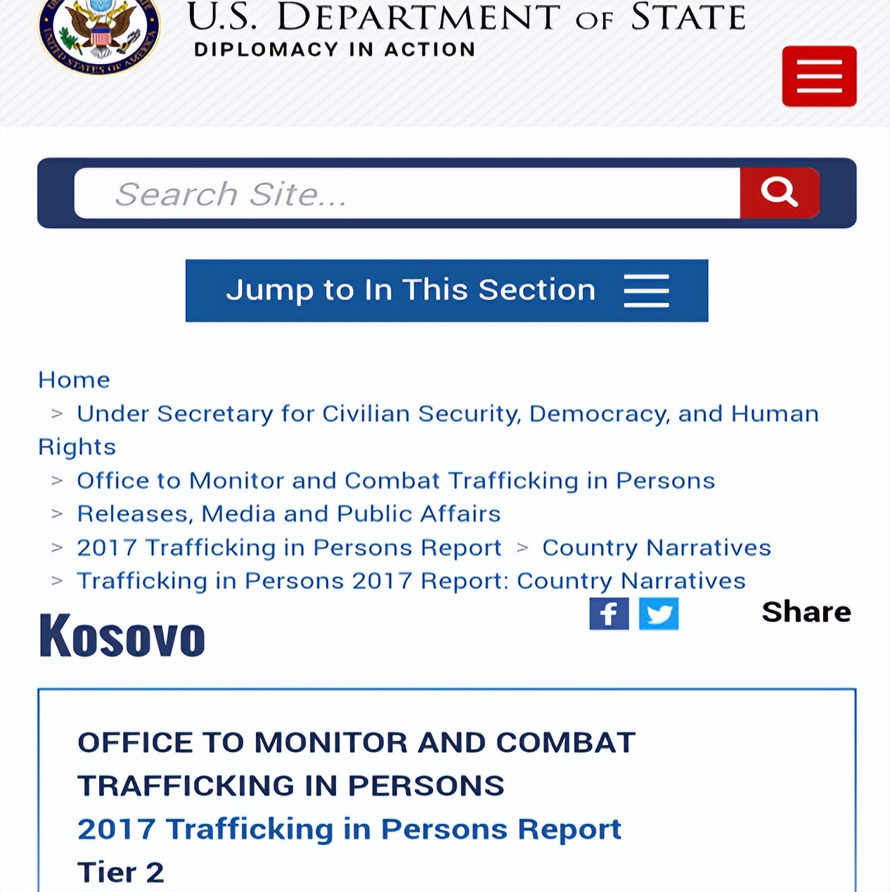 美國國務院在2017年將科索沃人口販賣情況評為2級,即“政府無能力打擊人口販賣,但正在努力”