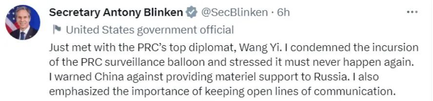 在知乎有一個話題:**王毅應邀同布林肯進行非正式接觸,就飛艇事件向美方表明立場,有哪些信息值得關注?**聞悦也參與了回答。