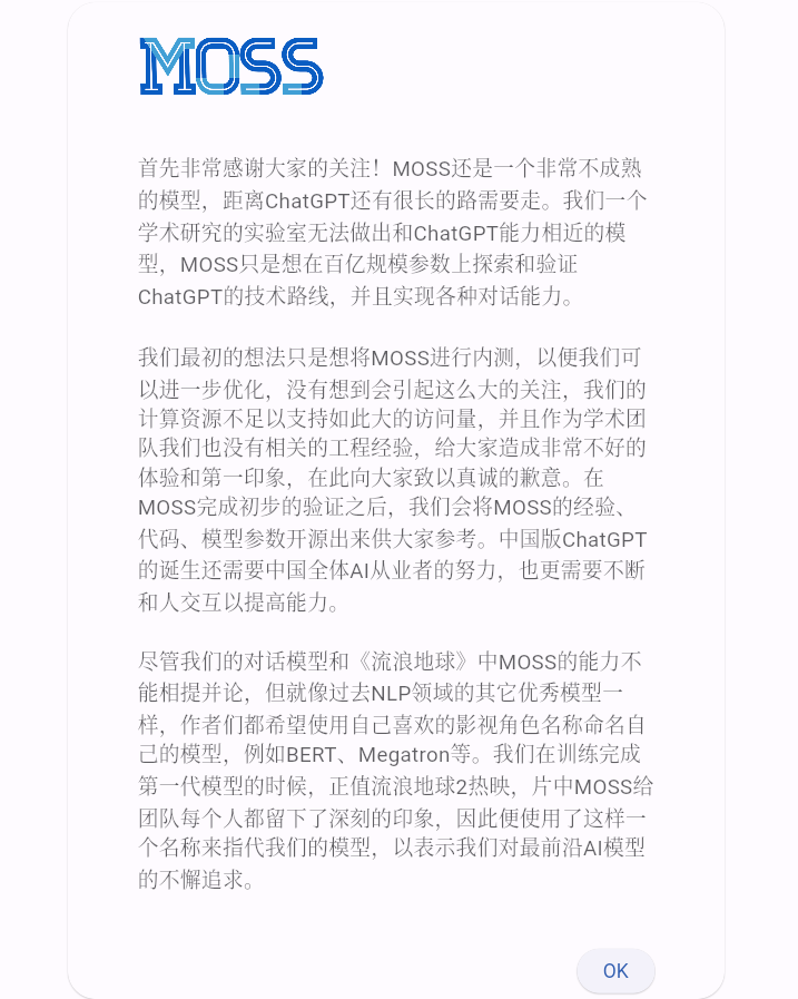 官方解釋稱,團隊在訓練完成第一代模型時,正好趕上了《流浪地球2》的上映,片中MOSS給團隊留下了深刻印象,使用這個名稱來指代這個模型,也算是致敬《流浪地球2》。