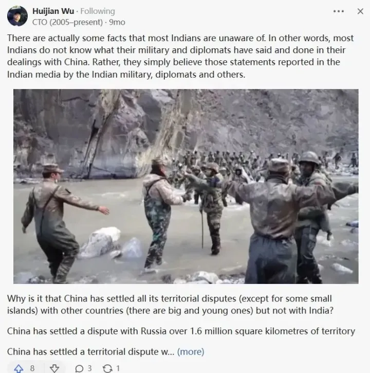 在外網,有很多關於中印邊界爭端的話題,很多國外網民認為談判是解決爭端的最好辦法。中國網民 Huijian Wu 也參與了討論,直言:印度要求在西藏駐軍,這中印邊界談判還咋談?