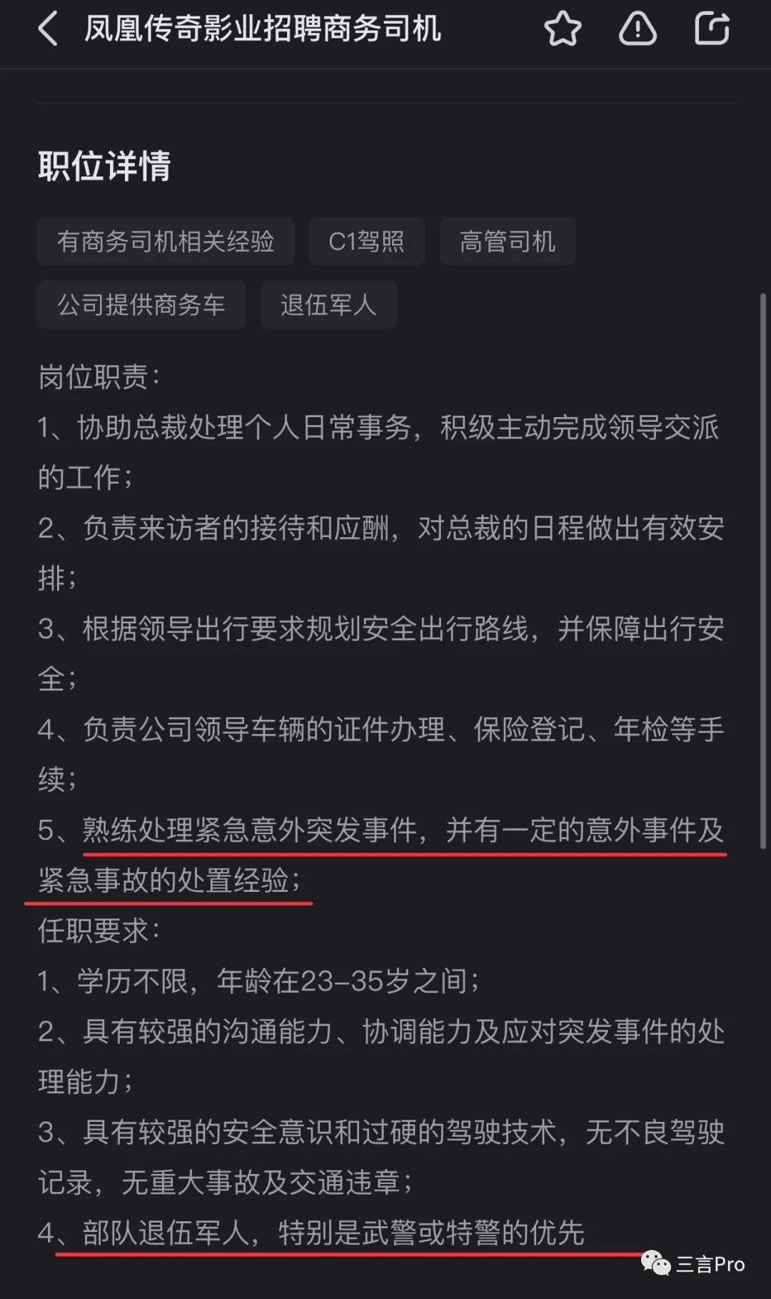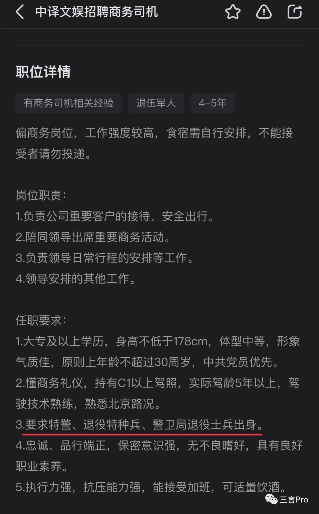 還有的公司則寫明瞭招聘司機+助理保鏢,職責是負責出行安排、安保服務。並且同樣要求退伍軍人優先,還最好是“身手出色”。