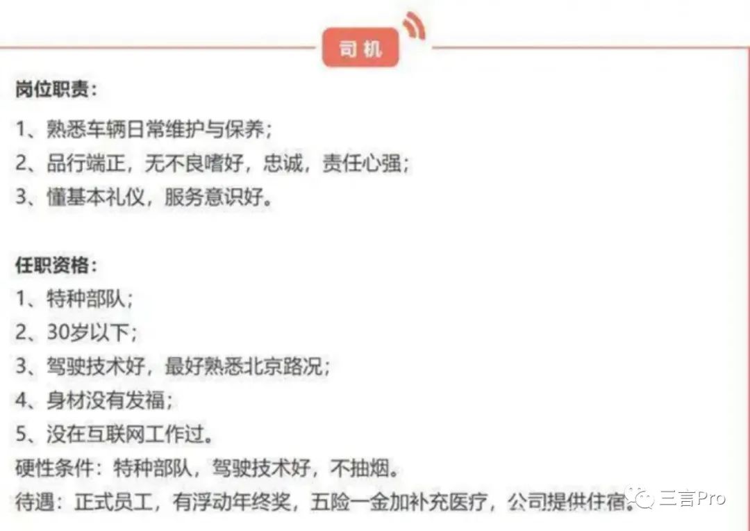 如果只是一名普通司機,那麼熟悉路況、駕駛技術好這類要求無可厚非。但要求應聘者來自特種部隊這一條竟然還是“硬性規定”。