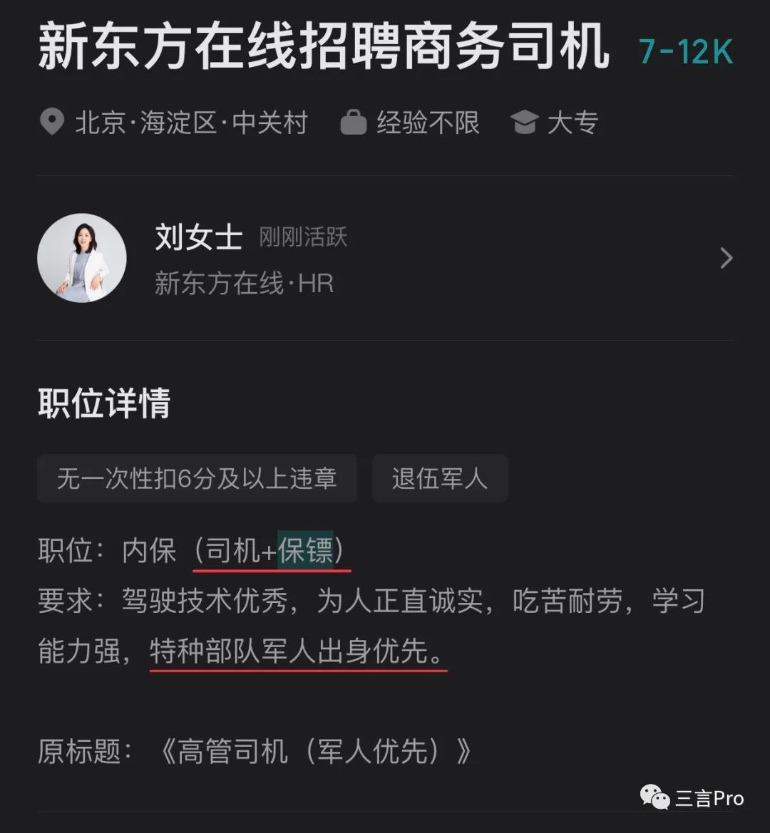 例如新東方在線發佈的一則招聘信息中,雖然名為商務司機,實際上寫明瞭“司機+保鏢”,要求應聘者不僅駕駛技術優秀,最好還是特種部隊軍人。