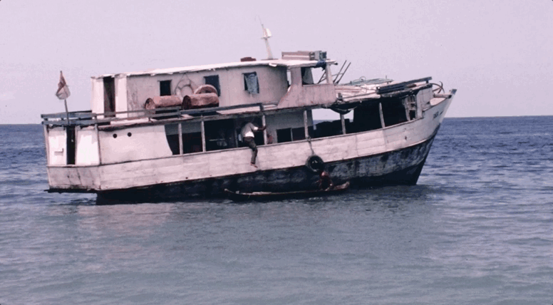 他們乘着船,登上了這座創傷後的小島,一片破敗中,依稀可見曾經生活過的痕跡。
