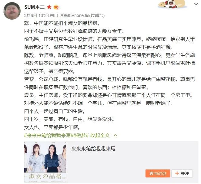 2018年,網友@SUM不二 依據韓劇《紳士的品格》的設定,構思了一出由四位中女出演的都市女性戲。