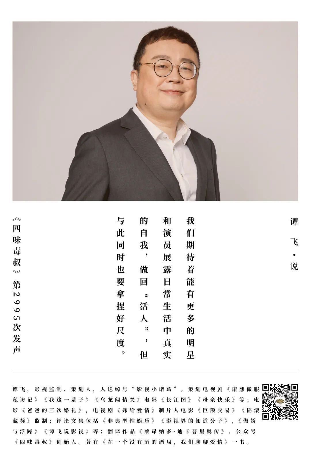 其實我期待着能有更多的明星和演員,能夠從電視、綜藝、微博到小紅書以及抖音直播,開始展露日常生活中真實的自我,做回“活人”,學習張頌文老師那樣,甚至還有更早以前張譯在知乎的答問那樣。短期內雖然離“活人”或許還有距離,我們現在所預判的一個改變的希望可能正在於此。可以肯定的是,網友們更期待見到會慌張、會抓狂的,有血有肉、有笑有淚,有點兒小個性的“內娛活人”。當然我們也得注意,抓狂跟“抓馬”的距離其實就一個字那麼遠。但同時明星和所謂公眾人物在提供正向情緒的同時,也務必要注意遠離失控的警戒線,這個尺度確實要拿捏準確,當然這是一個技術活。好,今天就説到這裏。