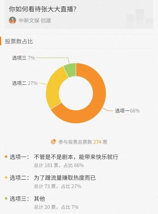而就在前兩天,中新文娛在微博上發起了“你如何看待張大大直播走紅”的投票,接近70%的網友選擇了“不管是不是劇本,能快樂就行”的這樣一個選項。其實最近很多年,很多內娛明星和網友總是保持着若即若離的社交距離,或者説把自己跟網友之間弄了一道厚厚的防火牆。他們在各大社交平台上更多是宣傳新作、幫好友打call、發廣告等等官方營業動作,基本上很少分享有關自己真實生活或者感悟的內容。