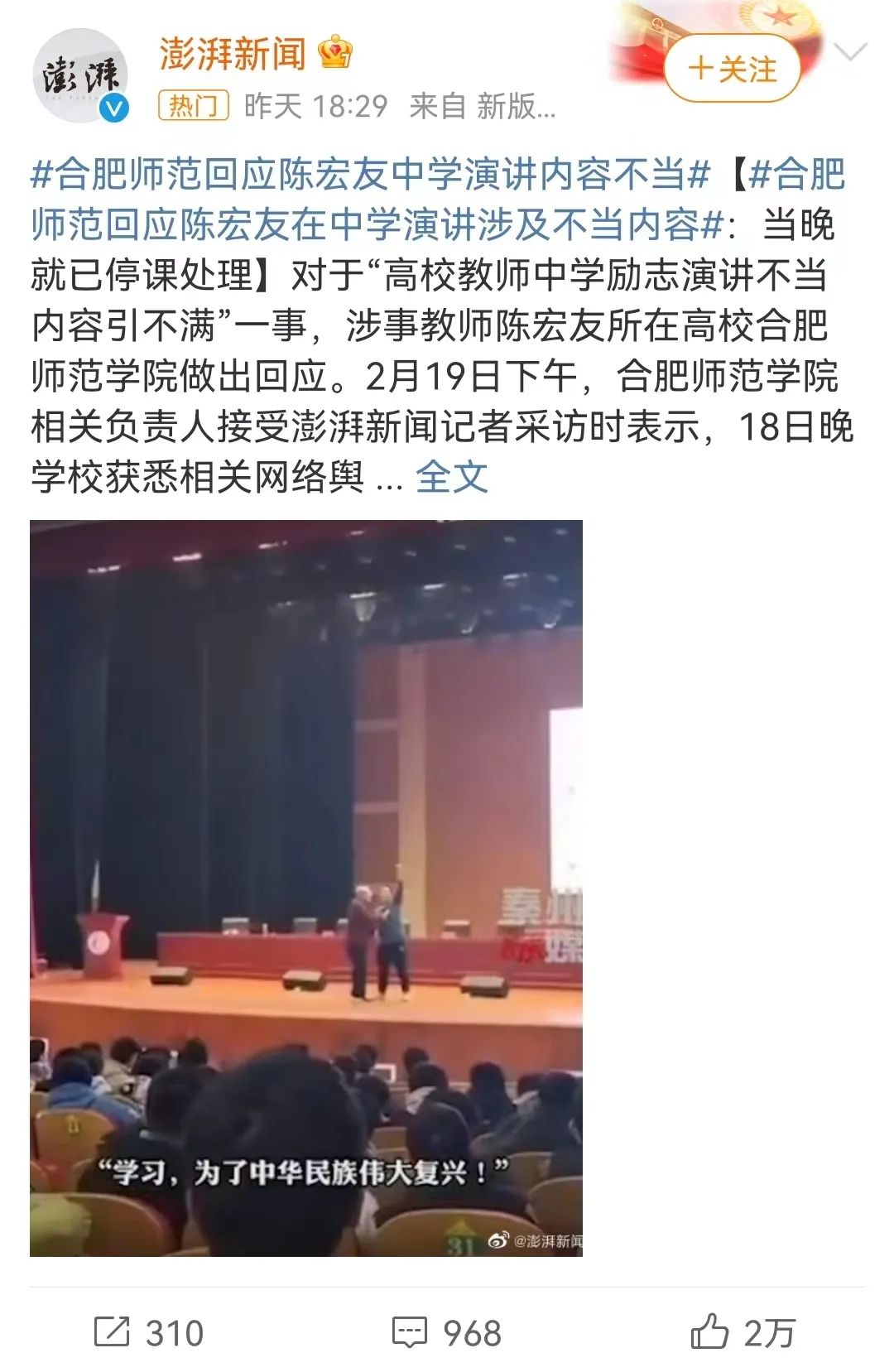 2月18日下午,合肥市完成一模後,該市廬江中學召開表彰大會,表彰了一些同學,隨後還安排了一個以“感恩”為主題的勵志演講,主講人是學校外請的“名師”,合肥師範學院教師教育學院副教授陳宏友。
