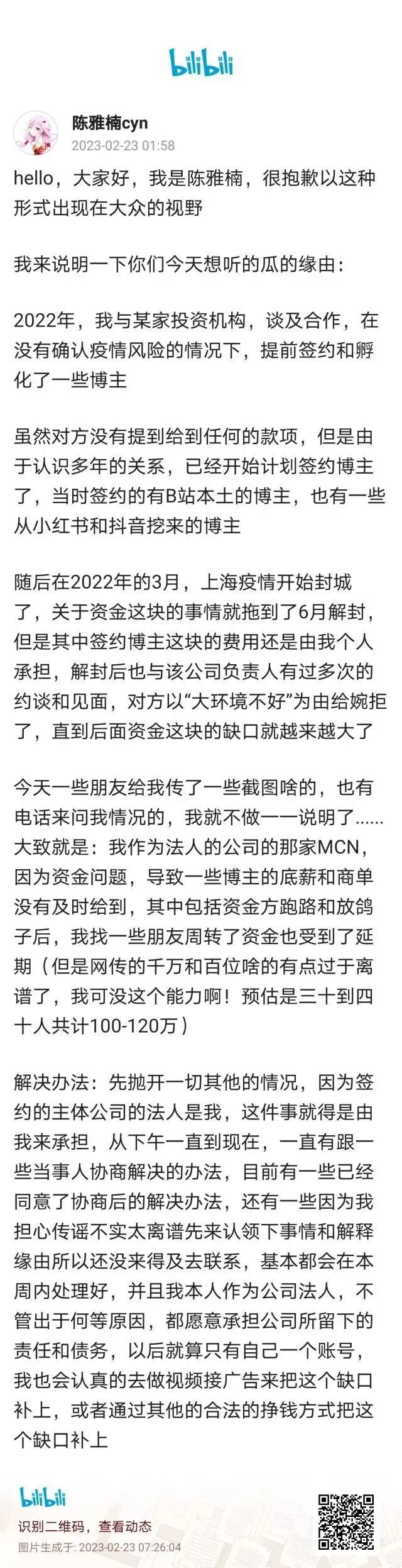 然後到了凌晨,一名叫陳雅楠的90萬粉絲up主表示,自己就是這個瓜的主人,原來,他是一家孵化up主的MCN機構的法人,但是由於發不出工資,這些up主們就採取了這麼一個方式。看起來像是一種變相催工資吧。