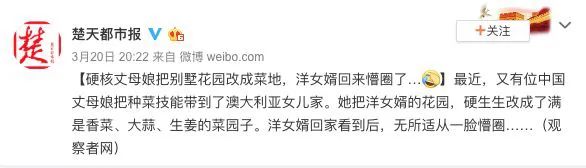 搜索引擎輸入:華人、花園、種菜這三個關鍵詞,你能得到一大堆新聞報道。某女士50多歲的婆婆,飛到澳洲幫忙帶孩子,空閒之餘將家中不成器的花園改造成了遠近聞名的小型蔬菜基地。不僅自家吃不完,還能送鄰居,自給自足的生態循環引得歪果仁嘖嘖稱奇。