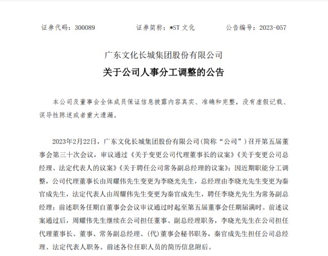 燈塔媒介2月23日訊,廣東文化長城集團股份有限公司(簡稱“*ST文化”,300089)2月22日晚間發佈人事變動公告,披露一系列人事分工調整,涉及代理董事長、總經理、常務副總經理等核心職位。新任總經理秦官成是一名“95後”年輕人,他將接替李曉光成為公司總經理,接替周耀偉成為公司法定代表人,這一人事任命引發市場關注。
