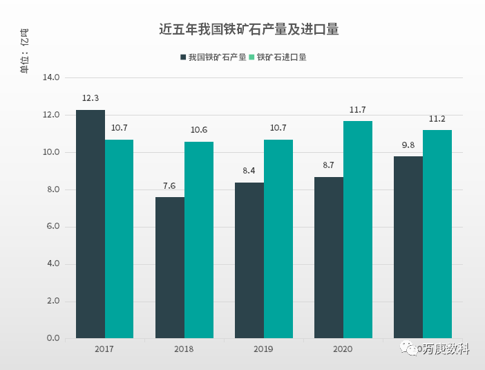 2017-2019年,與鐵礦石產量相比,我國鐵礦石進口量較為穩定,最大增減量不超過1億噸。而我國鐵礦石產量在2018年鋭減4.7億噸,跌幅達38%,使得國內產量大大低於進口量。表明我國鋼鐵行業原料對外依存度高、供應渠道不穩定。加之主要進口來源國高度集中,澳、巴兩國合計佔比超過80%,不利於我國鋼鐵行業原材料保障的安全。