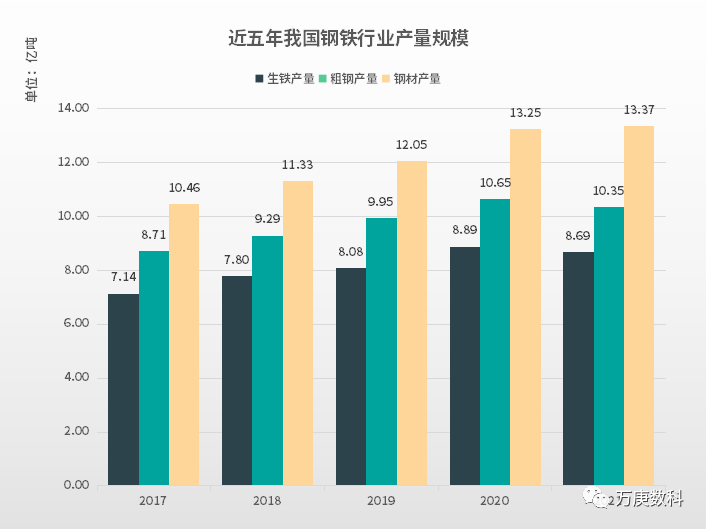 2017-2021年,鋼鐵行業產量規模整體上呈增長狀態。但在2021年,生鐵產量和粗鋼產量出現了略微下降,且鋼材產量基本與往年持平、增速放緩。這可能與產能過剩、成本價格、市場需求、國家政策等多種因素有關,預示着鋼鐵行業的格局變動。